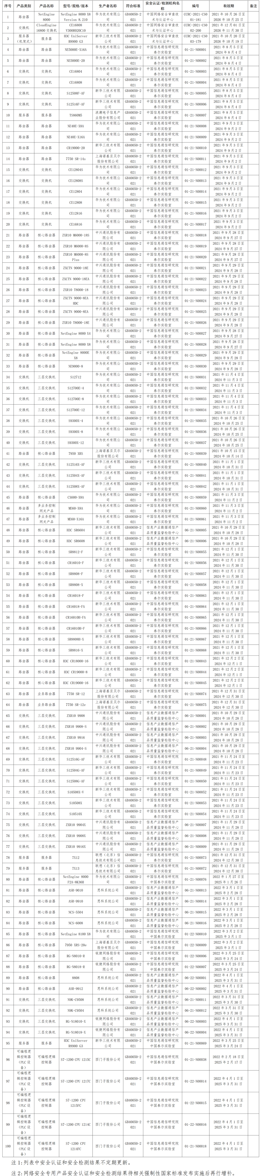 网络关键设备和网络安全专用产品安全认证和安全检测结果